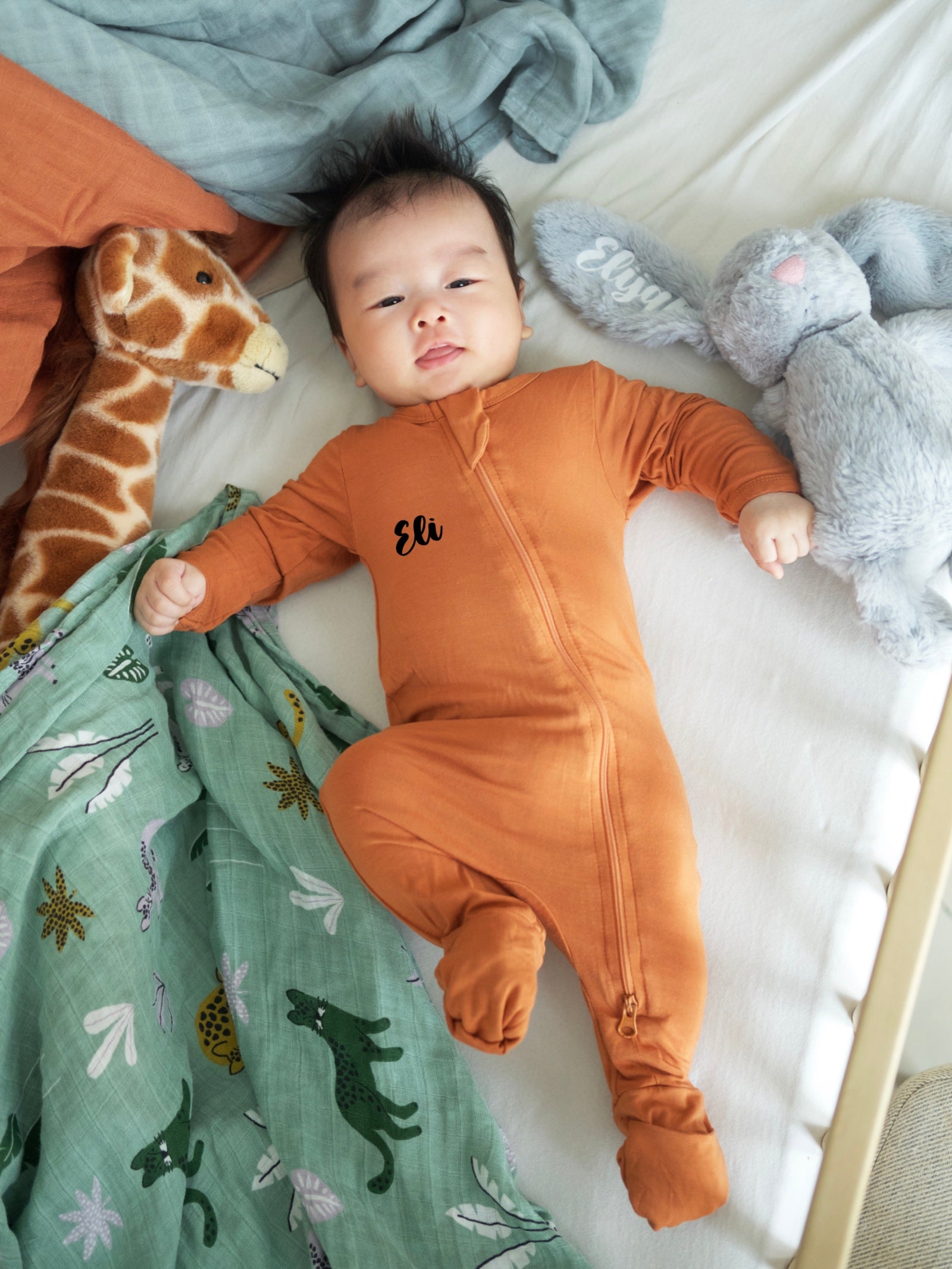 Tuck your little one into bed with our soft cotton knit baby blankets in beautiful animal prints, snug as a bug in our premium organic cotton rompers personalised with his or her name, with a cuddly plush best friend to hug goodnight.
